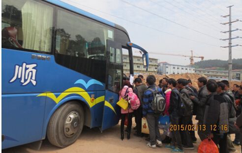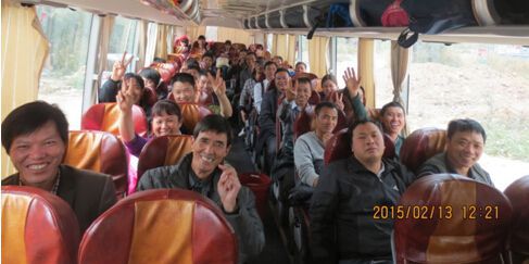 2月13日當(dāng)天,完成了一年工作的工人們,一大早便在生活區(qū)門口集中了,大家手拿著回家過(guò)節(jié)的禮物行李,心懷著和親人團(tuán)聚的激動(dòng)心情。在項(xiàng)目部保安的組織下,第一輛前往四川營(yíng)山方向的4號(hào)包車在10點(diǎn)30分發(fā)車駛出。中午時(shí)分,最后一輛前往湖南長(zhǎng)沙方向的2號(hào)包車也滿載著幸福的笑容出發(fā)了。